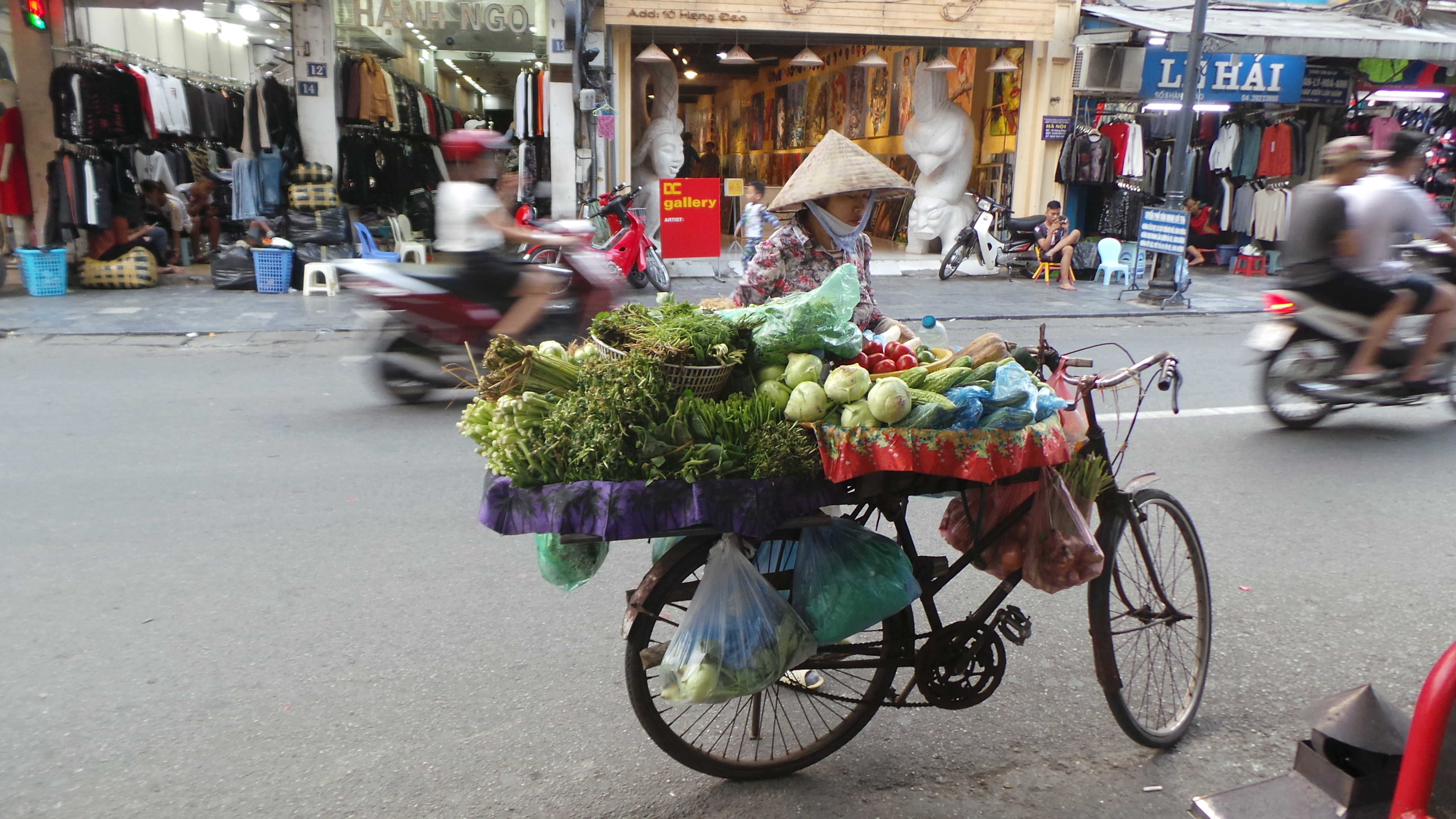 Marchande de légumes à vélo au milieu du tumulte de la ville. Hanoï. Vietnam. Ph. Julia Vernier 2018.