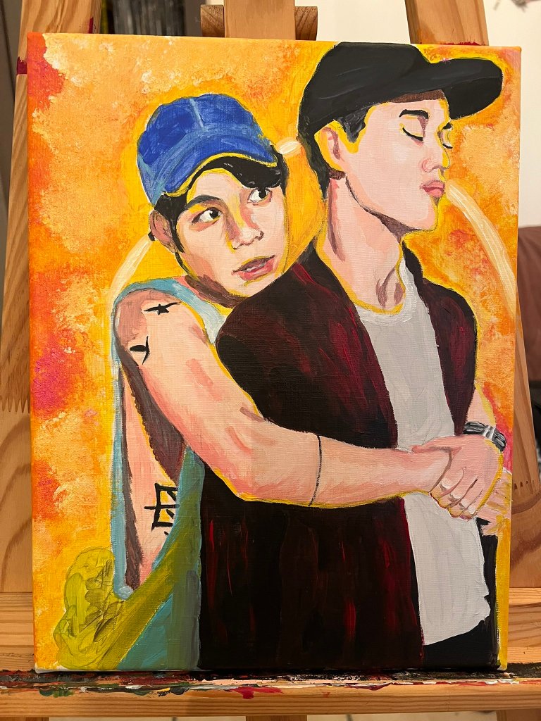 Pendant de longs mois, je n’eus plus aucun symptômes. Je me croyais guérie, jusqu’à ce que ne déboulent mes très chers DanYok (GawinFirst) avec la série Not Me. GMMTV avait fait fort en me recontaminant avec deux beaux garçons artistes peintres accompagnés d’une histoire forte et romantique à souhait. Ils l’auraient fait EXPRES qu’ils ne s’y seraient pas pris autrement. La fièvre des théories accompagnée du stress de ne pas savoir comment finirait leur histoire, aucun doute, c’était le retour du syndrome. J’avais TRES GRAVEMENT rechuté, jusqu’à produire un edit par semaine. Franchement, je pense que je n’ai jamais été autant atteinte. J’en garde d’ailleurs des séquelles qui me poussent, des mois après la fin de la série, à peindre leur portrait en souvenir (ci-dessous) après avoir payé une somme folle pour les revoir en DVD en provenance de Thaïlande.